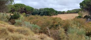 Más adelante, el porte de los pinos piñoneros nos impresiona por su altura y por su forma graciosa de parasol chino. Su corteza, de color marrón rojizo, grueso y libre de ramas, que el propio árbol va podando.