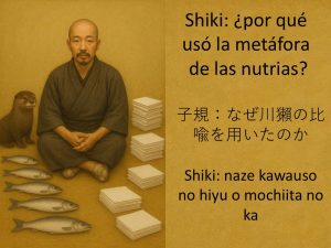 Shiki pues, usaba este ceremonial de las nutrias como una metáfora para referirse a los escritores que, como él, esparcen y disponen a su alrededor los textos que son sus referencias, de manera previa para ponerse a componer.