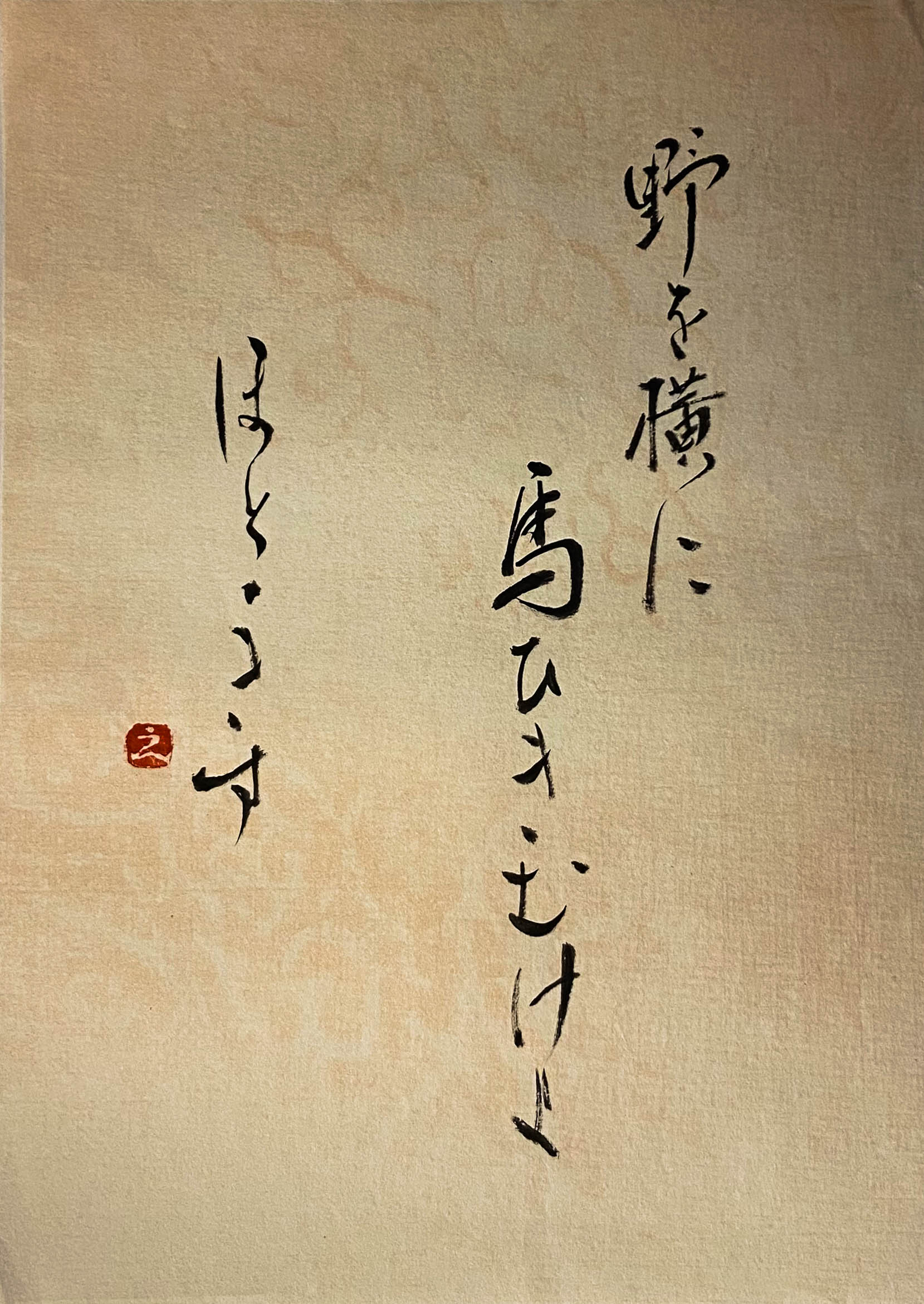 Caligrafiado por Elena Hikari bajo la copia de nuestro maestro Hikita “Sekiin” – Haiku de Matsuo Bashou.