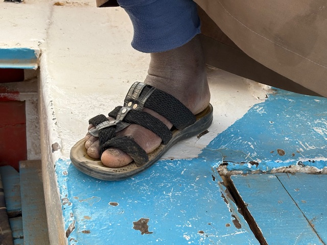 Acompaño fotografía para que el lector curioso pueda apreciar la sandalia que calza un pie gastado por el trabajo de muchos años a la intemperie. Es el pie de un trabajador. Pertenece al barquero de una faluca de un río –dicen que el más largo del mundo– obligado por la necesidad a transportar a turistas un día tras otro, sea o no festivo, a cualquier hora del día.