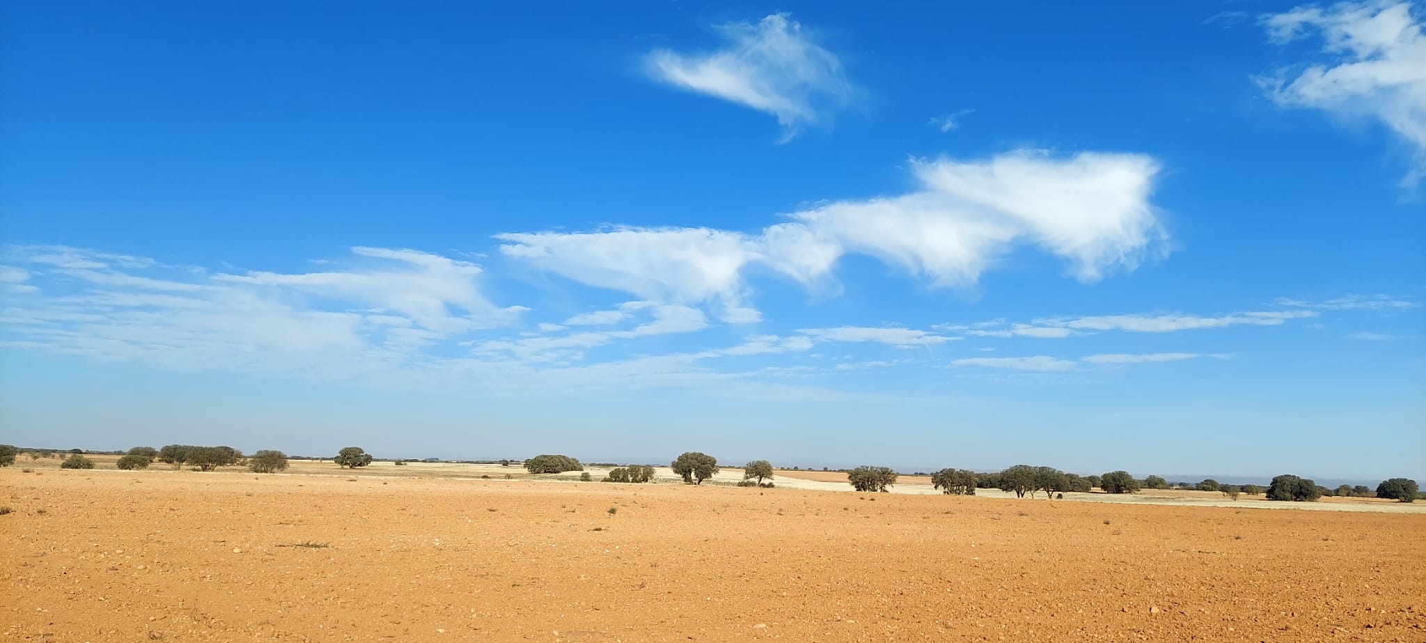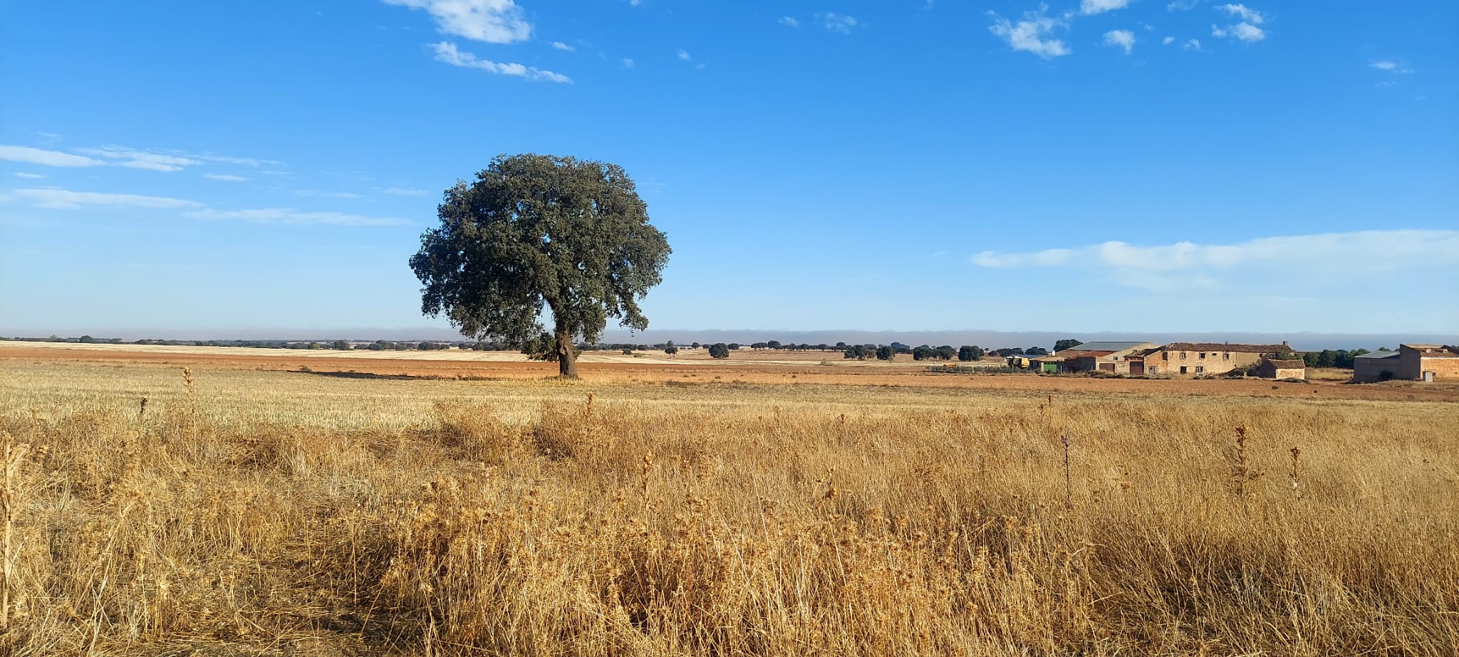 La tierra de ambiente seudoestepario, con apenas lluvias este verano, es marrón- rojiza y seca, con rastrojos, lindes y bolos de sílice en grandes extensiones de campos de cultivo de secano.